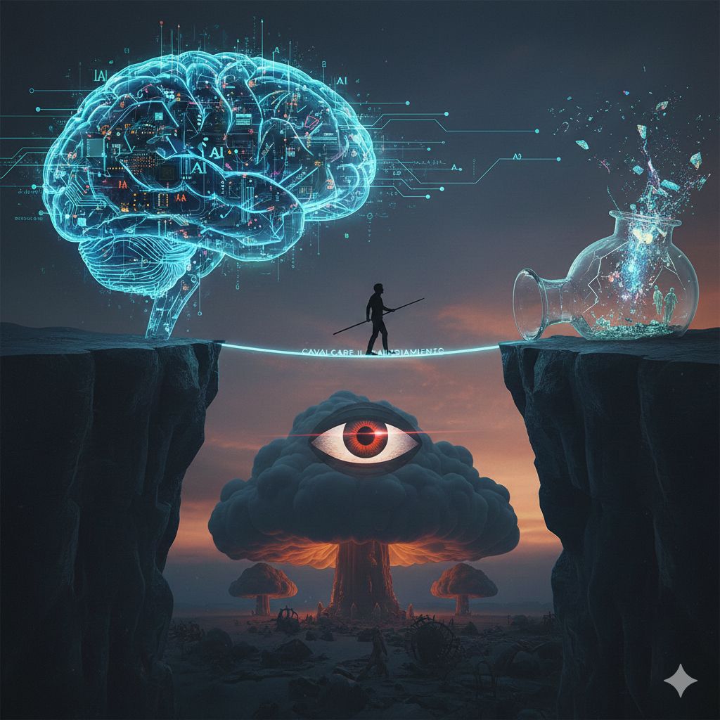 Per “terminarci” ce la facciamo benissimo da soli… di certo, non abbiamo bisogno di aiuti esterni. Basti pensare alle armi atomiche che, sempre più in maniera inquietante, assomigliano alla “pistola” di cui parlava Cechov: finché circolano e proliferano, c’è da preoccuparsi. Sempre Cechov diceva che, se si intravede una pistola in scena, di solito prima o poi qualcuno la userà per sparare. Stesso discorso riguarda tutte le armi, specie quelle che potrebbero porre fine al genere umano. Crearle ha significato – lo sappiamo tutti – scoperchiare il vaso di Pandora. Ora non ci resta che continuare a camminare come equilibristi sul filo del baratro, che sta sotto e tutt’attorno a noi e ci fa l’occhiolino quando guardiamo giù.